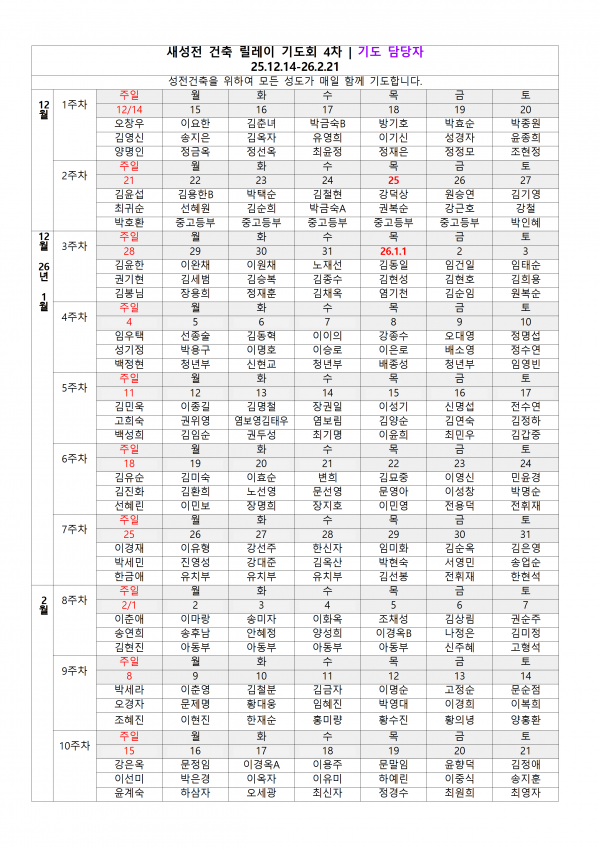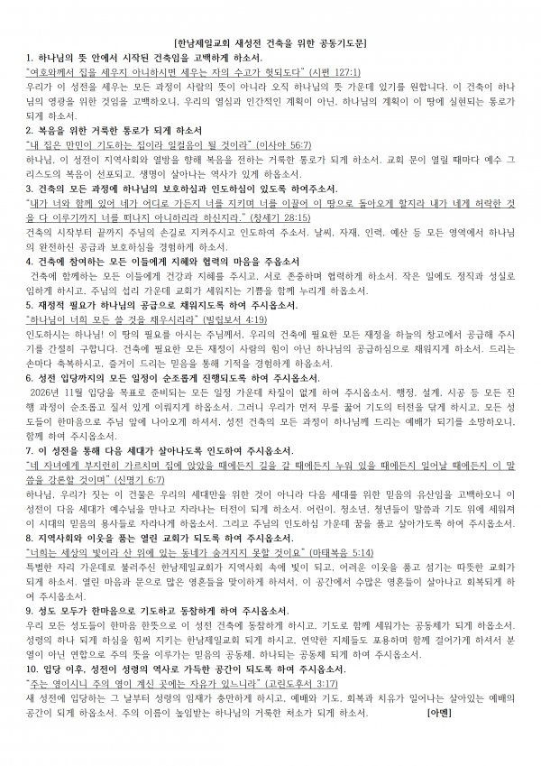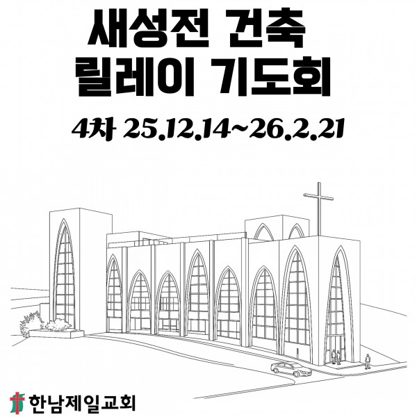 새성전 건축 릴레이 기도회 4차 25.12.14~26.2.21 페이지 정보 작성자 한남제일교회 작성일25-12-12 16:41 조회137회 댓글0건 관련링크 목록 본문 새성전건축 릴레이 기도회 4회차 1) 25년 12월 14일(주일) - 26년 2월 21일(토)2) 기도 방법 :① 70일(10주)간 하루 3번 전교인 릴레이 기도합니다.② 전교인들이 아침, 점심, 저녁 지정된 시간에 기도합니다.③ 준비된 기도문의 내용을 가지고 기도합니다.④ 완공될 때까지 10주씩 회차로 진행합니다. (26년 10월 31일까지 총 7회) 댓글목록 등록된 댓글이 없습니다. 목록