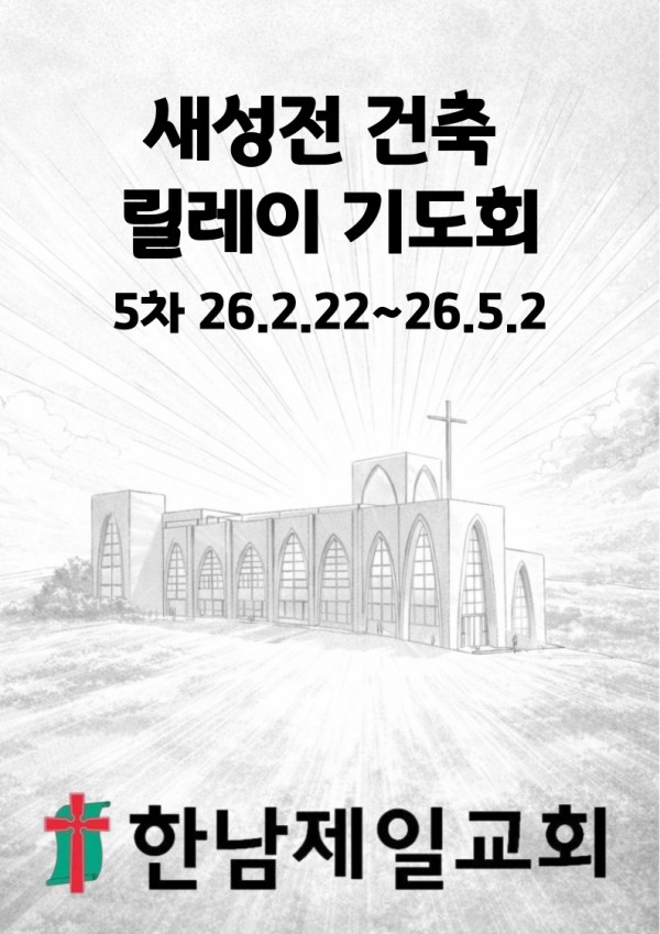 새성전 건축 릴레이 기도회 5차 26.2.22~26.5.2 페이지 정보 작성자 한남제일교회 작성일26-02-20 16:42 조회101회 댓글0건 관련링크 목록 본문 새성전건축 릴레이 기도회 5회차 1) 26년 2월 22일(주일) - 26년 5월 2일(토)2) 기도 방법 :① 70일(10주)간 하루 3번 전교인 릴레이 기도합니다.② 전교인들이 아침, 점심, 저녁 지정된 시간에 기도합니다.③ 준비된 기도문의 내용을 가지고 기도합니다.④ 완공될 때까지 10주씩 회차로 진행합니다. 댓글목록 등록된 댓글이 없습니다. 목록